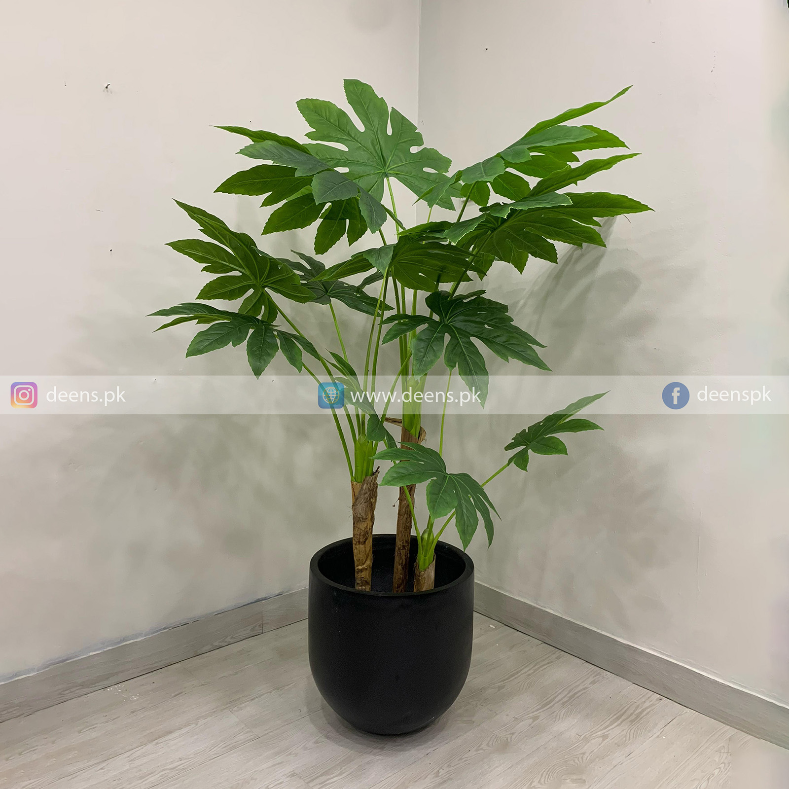 This artificial papaya plant is a lifelike decorative piece designed to replicate the natural beauty of a real papaya tree. It features realistic green leaves made from high-quality fabric or plastic, shaped and textured to resemble the broad, lobed foliage of a real papaya plant.